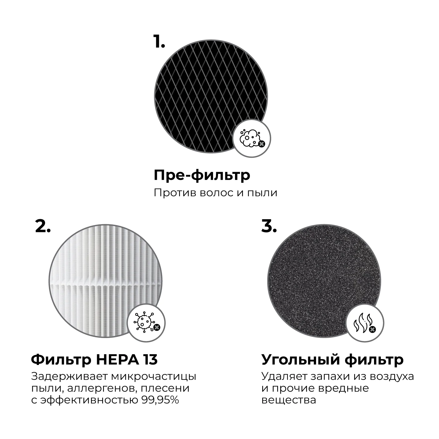 Сменный фильтр для умного очистителя воздуха UMI. Предфильтр захватывает пыль и другие крупные частицы, шерсть и пух питомцев, угольный фильтр устраняет неприятные запахи, поглощает формальдегиды и прочие вредные вещества, а фильтр НЕРА Н13 избавляет от цветочной пыльцы, задерживает микронные частицы пыли, аллергенов и плесени с эффективностью 99,95%.