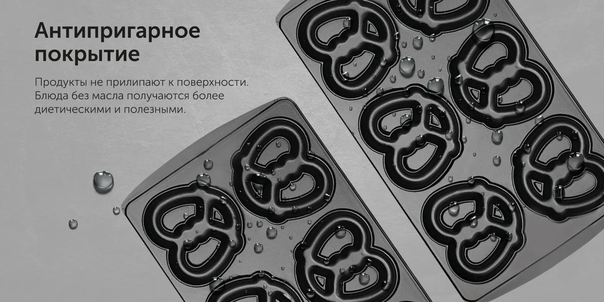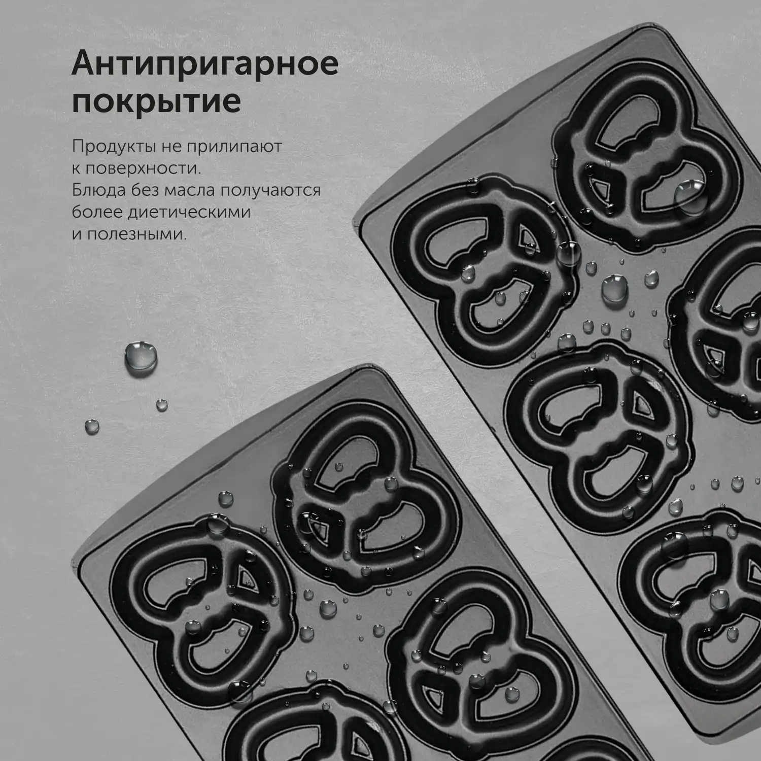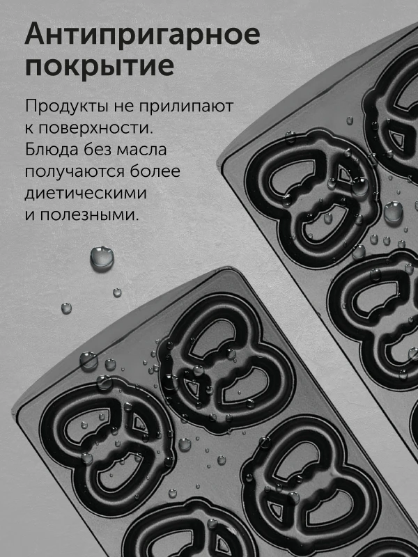 Панель выполнена из металла с антипригарным покрытием: она долговечна, и готовить на ней можно с минимальным количеством масла. Тесто не пригорает к поверхности и всегда легко отстает от формы.