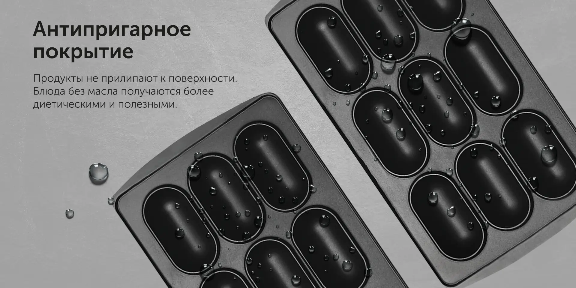 Панель выполнена из металла с антипригарным покрытием: она долговечна, и готовить на ней можно с минимальным количеством масла. Тесто не пригорает к поверхности и всегда легко отстает от формы.