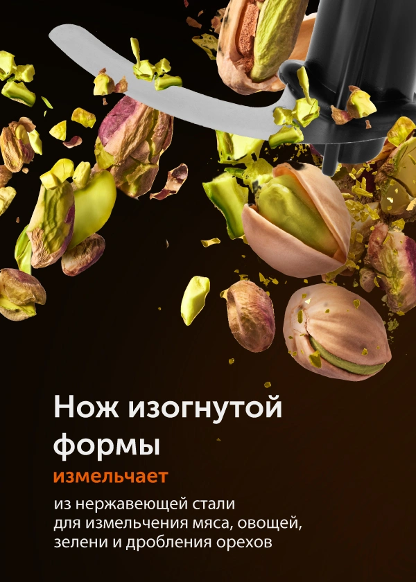 Лезвия измельчителя и насадки-блендера изготовлены из нержавеющей стали, что обеспечивает долговечность и надежность устройства.