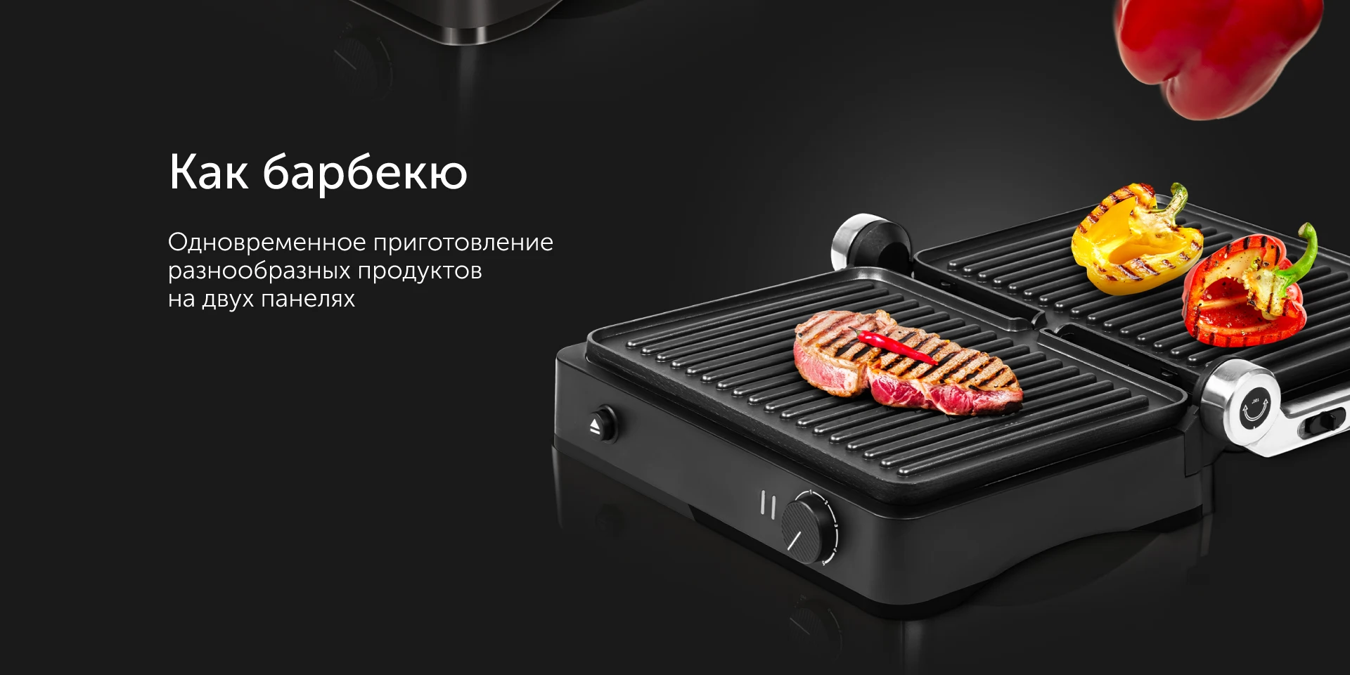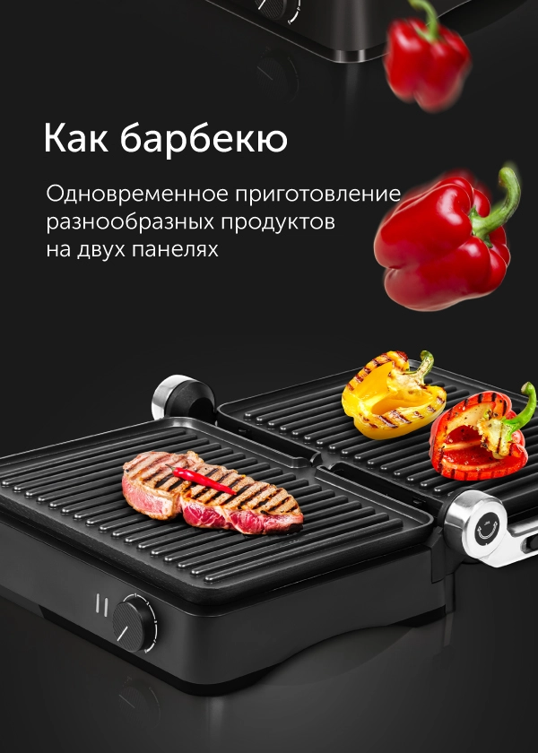 Гриль можно превратить в барбекю-жаровню, раскрыв его панели на 180 градусов – таким образом площадь для приготовления увеличится в два раза! Это позволяет на одной стороне обжаривать мясо, а на другой — булочки для бургеров или нарезанные овощи на гарнир. Устройте барбекю-вечеринку для семьи или друзей!