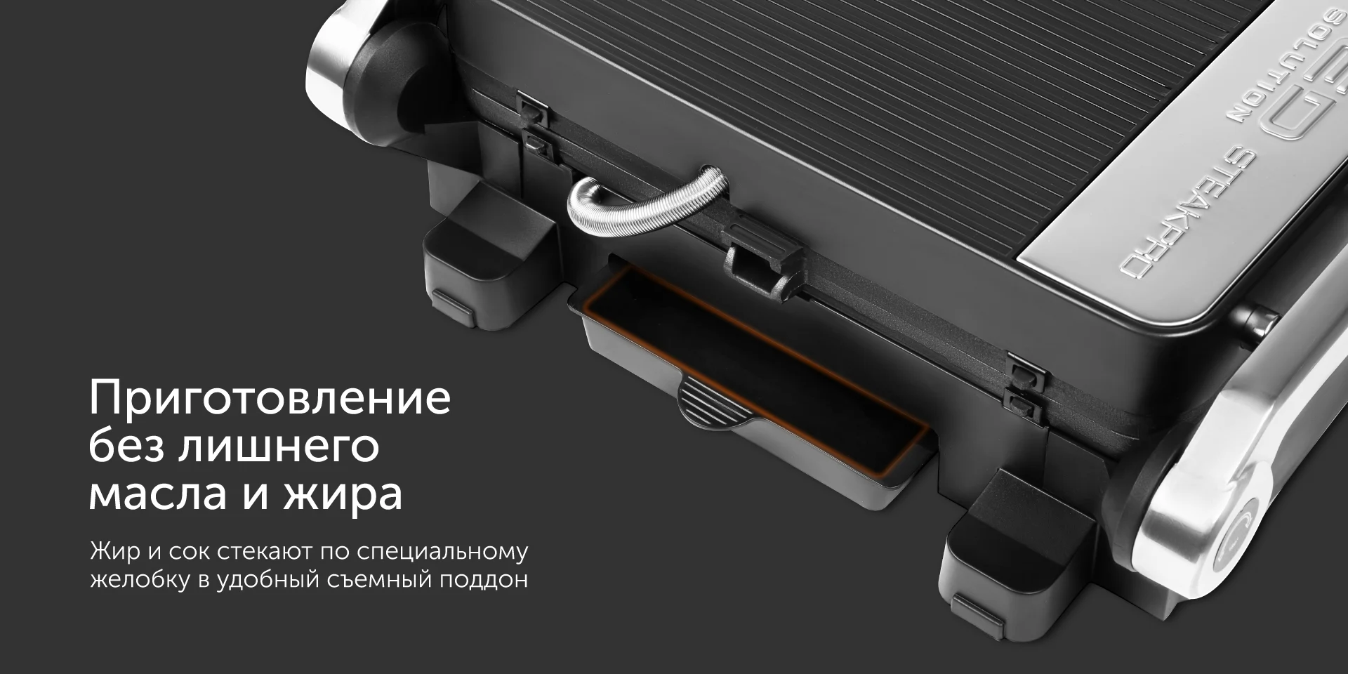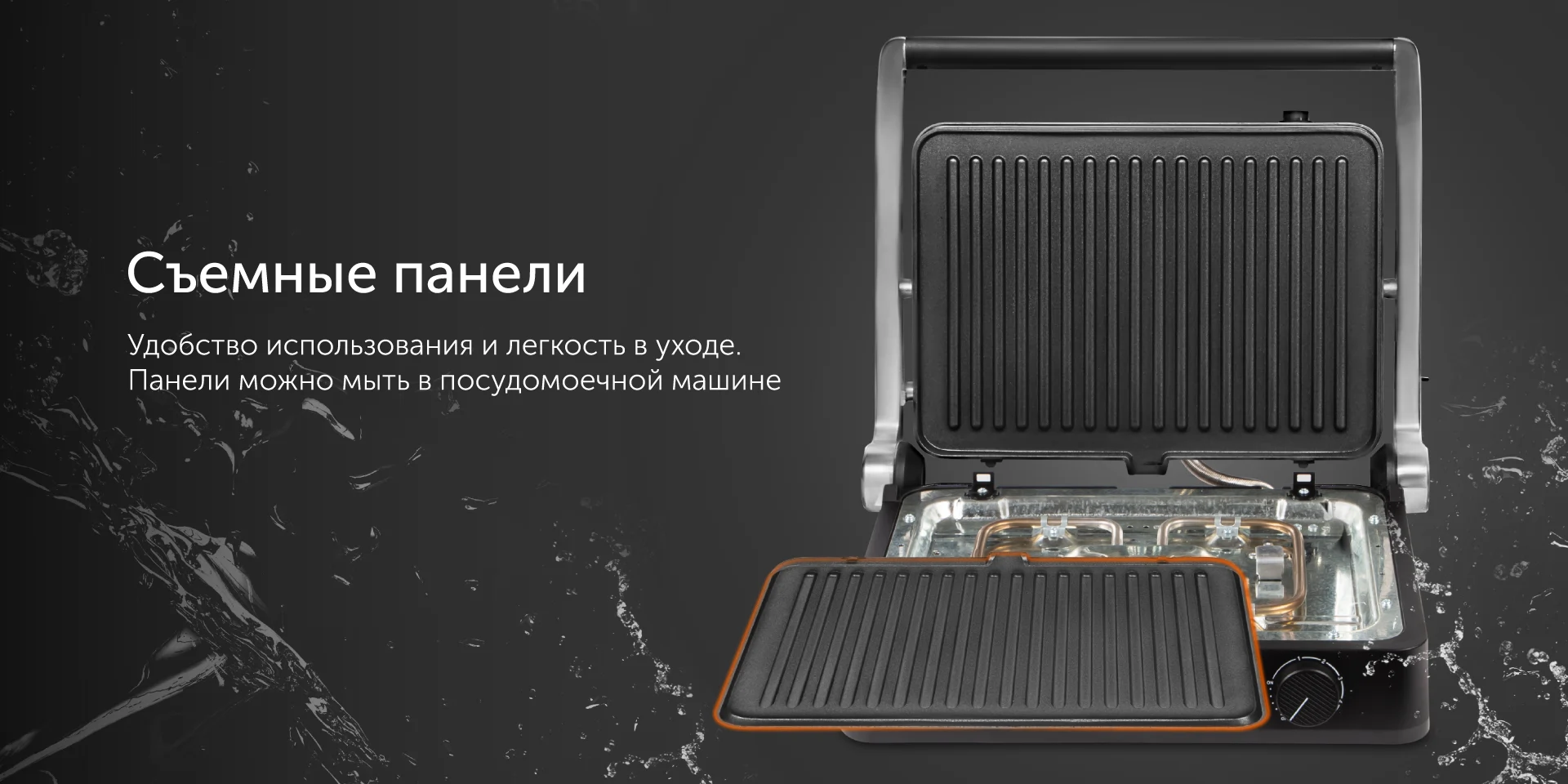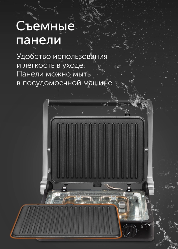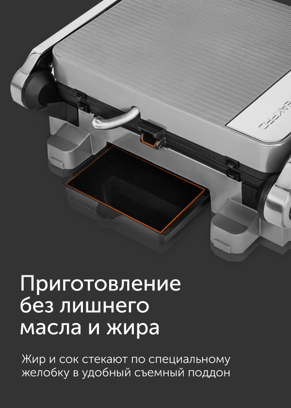 Устройство оснащено съемным поддоном, в который во время приготовления стекает масло и жир. Его, как и панели, можно снять и вымыть вручную или в посудомоечной машине.