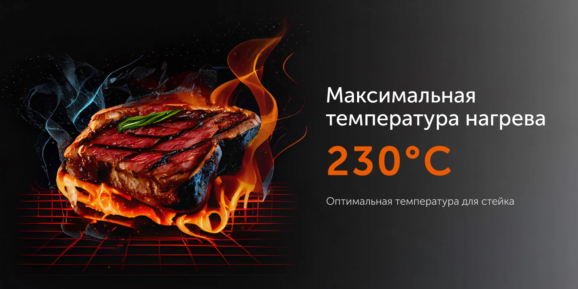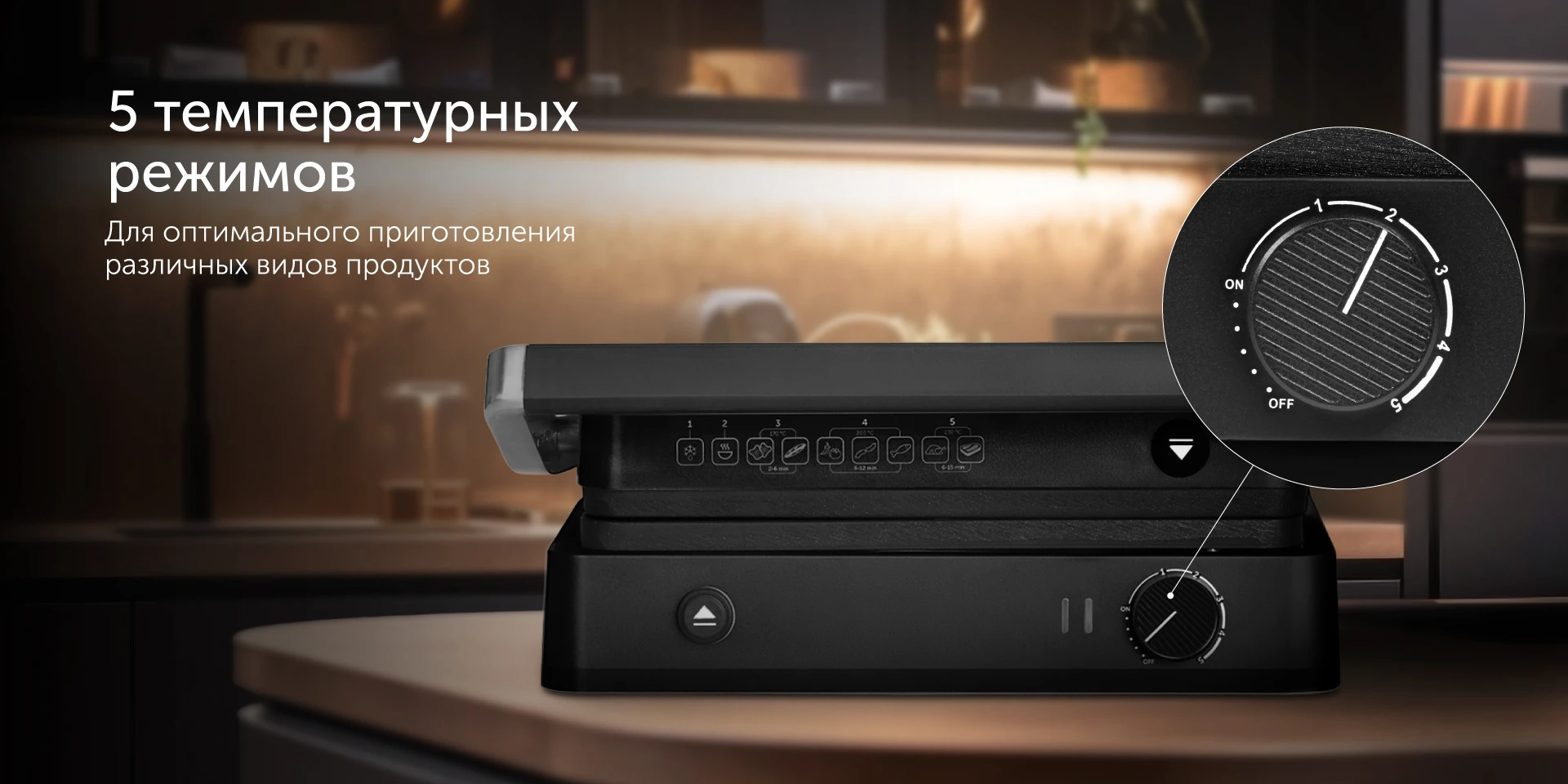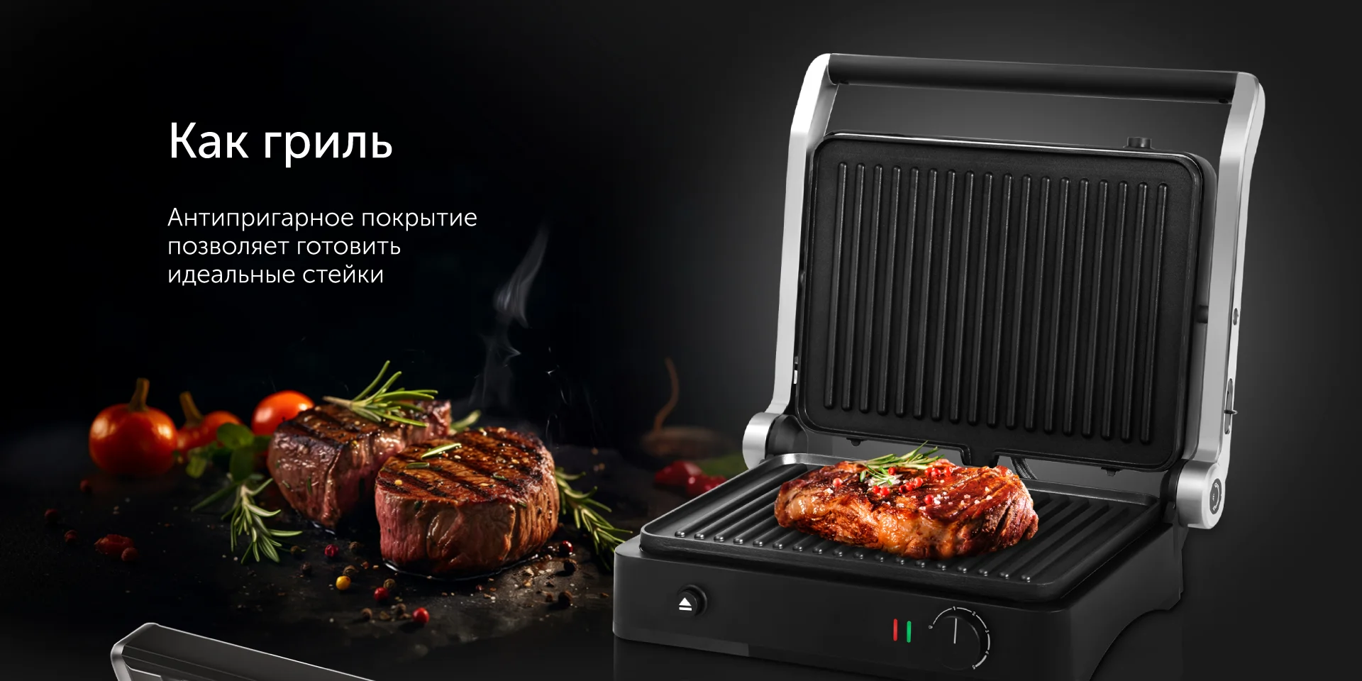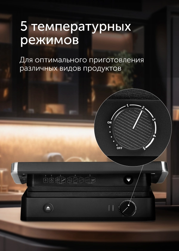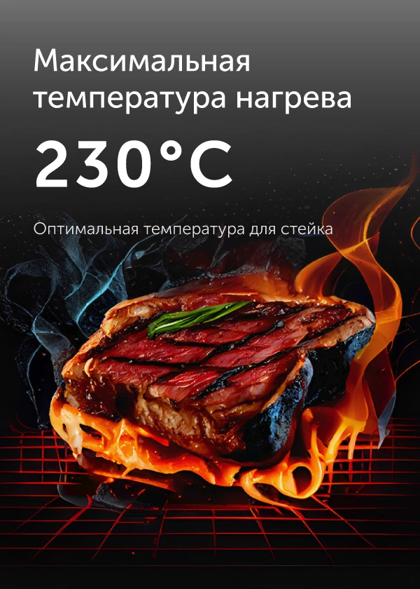 Жарьте аппетитные стейки или сочные овощи гриль – для этого нужно установить необходимую температуру, и специальный индикатор подскажет, когда прибор достаточно разогреется. Максимальная температура разогрева панелей — 230 °С, этого достаточно для равномерной прожарки мяса до аппетитной корочки снаружи и мягкости внутри.