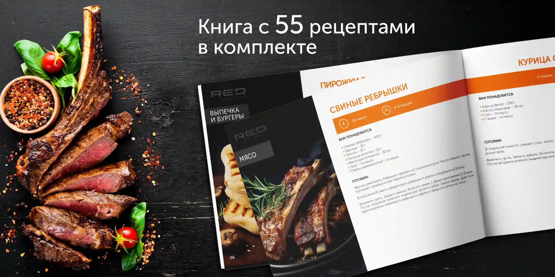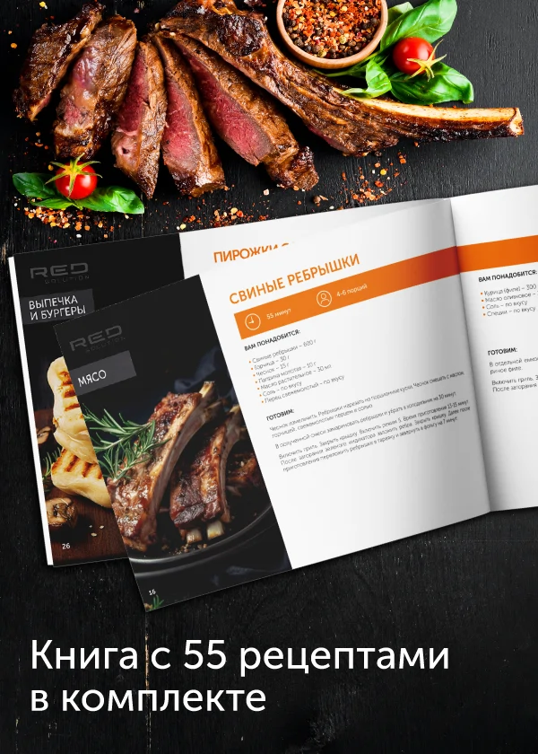 В дополнение к грилю вы получите книгу рецептов с пошаговыми инструкциями и рекомендациями по приготовлению от бренд-шефа RED SOLUTION.