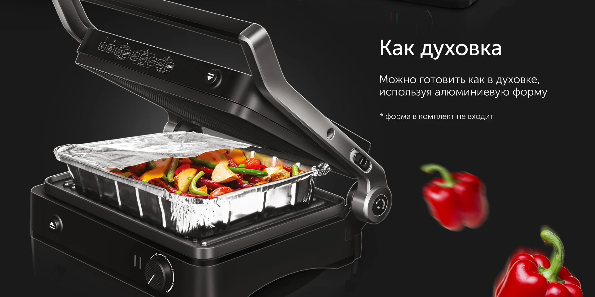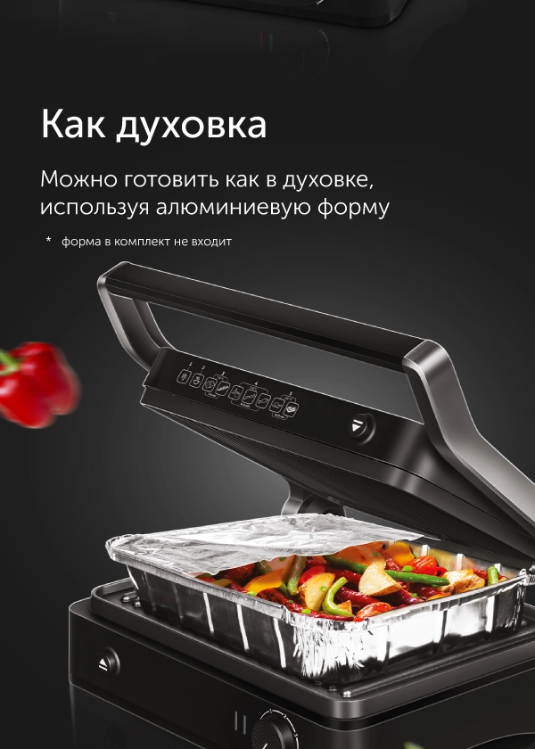 Для запекания в гриле вам понадобится специальная алюминиевая форма или противень, которые не входят в комплект и приобретаются отдельно. Запекайте блюда из мяса, рыбы и овощей, сытные и сладкие пироги, пиццу, бисквиты и различные десерты. В силу того, что гриль способен быстро разогреваться до высоких температур, блюда в нем запекаются гораздо быстрее, чем в обычном духовом шкафу.