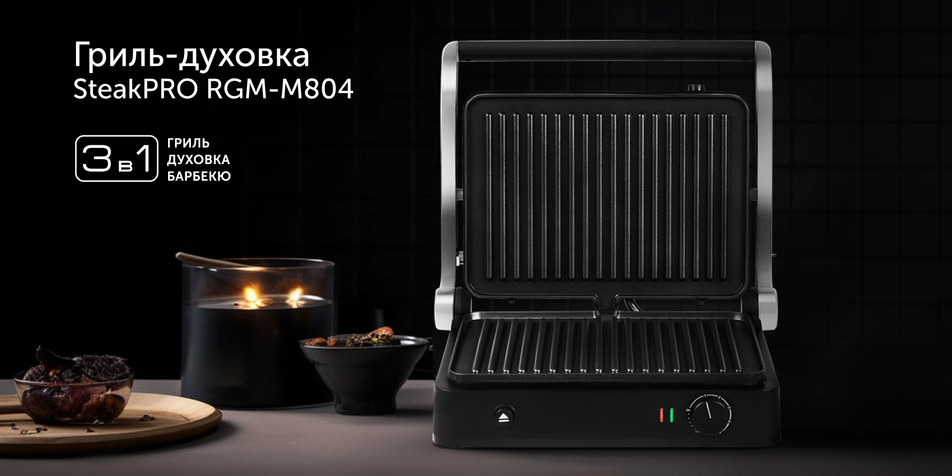 Гриль RED SOLUTION SteakPRO RGM-M804 — универсальный прибор «3 в 1» для жарки, запекания и барбекю. С ним просто и удобно готовить стейки любой прожарки, рыбу или овощи гриль, пироги, запеканки и десерты. Благодаря качественному антипригарному покрытию вы сможете обойтись минимальным количеством масла, и блюда получатся более здоровыми и полезными. Компактная и мобильная модель отлично подойдет для использования как дома, так и на даче.