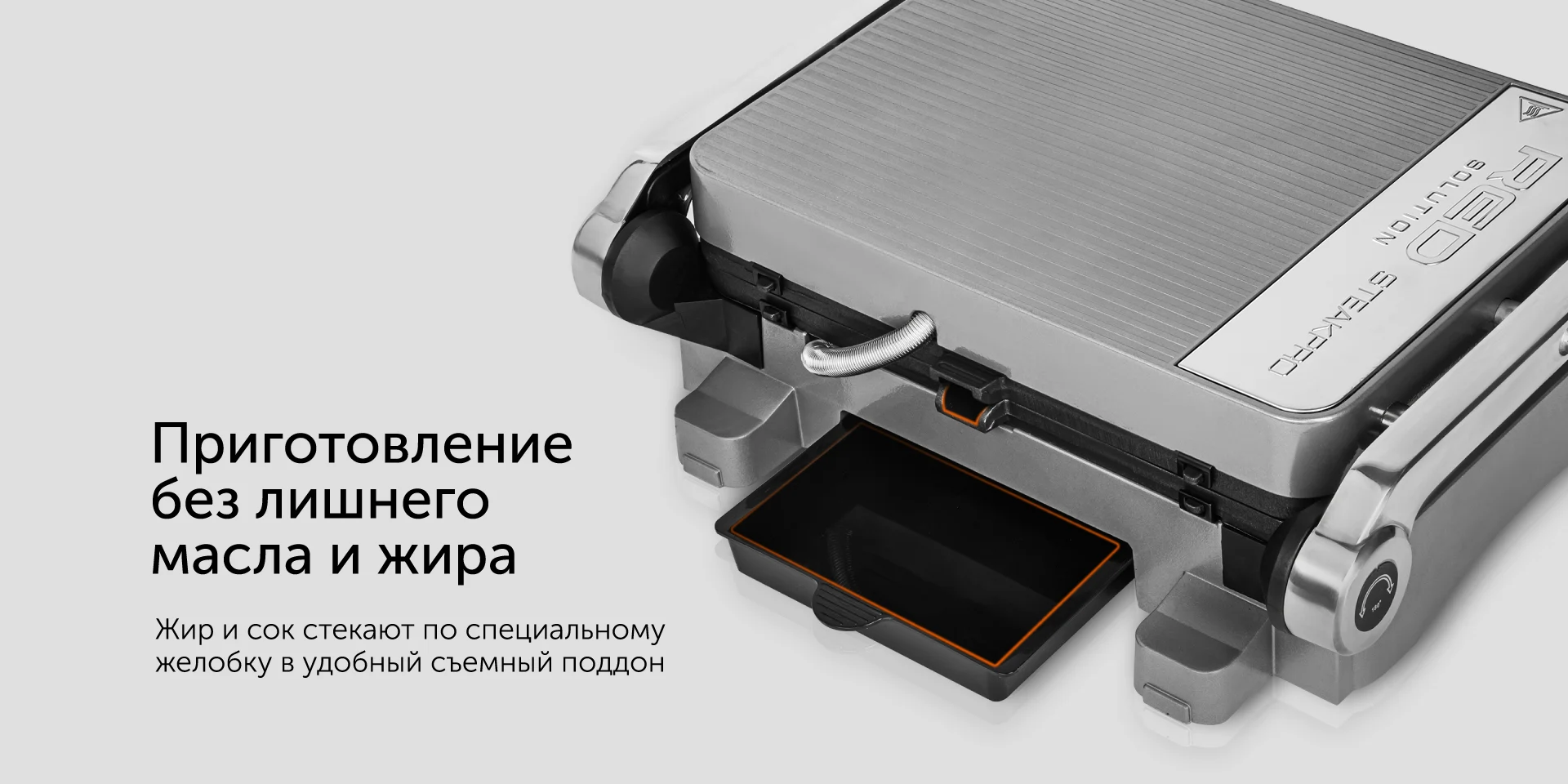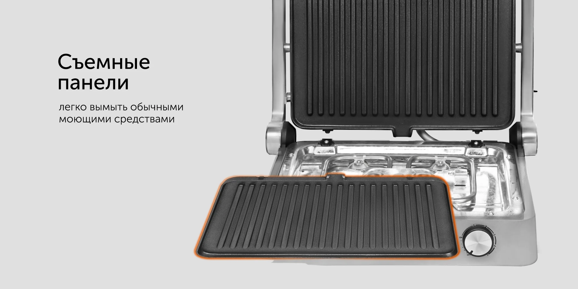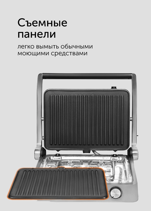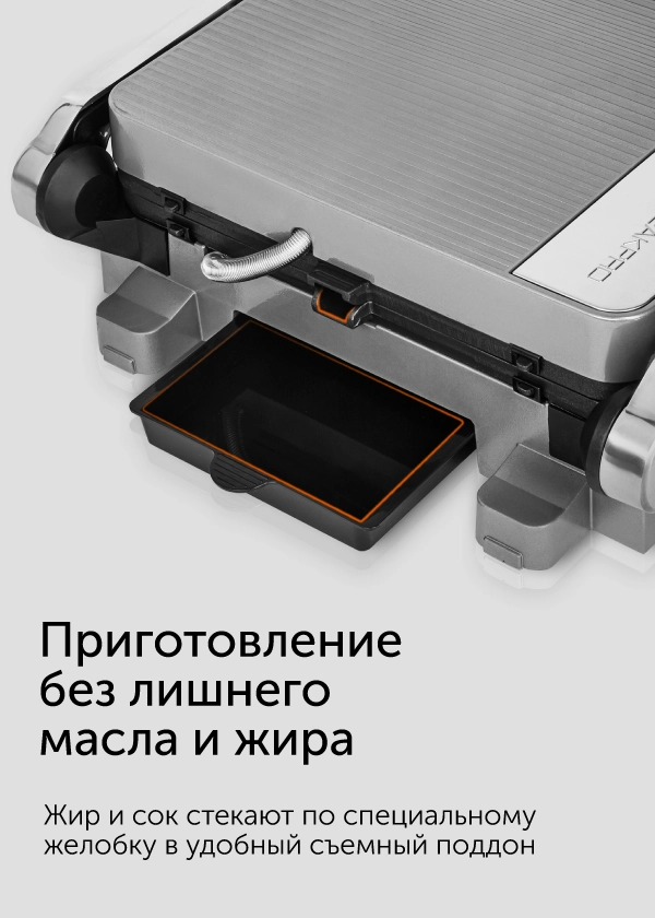 Гриль оснащен съемными панелями, которые расположены слегка под наклоном. Лишний жир стекает в специальный поддон. По окончании приготовления достаточно снять съемные элементы и вымыть с мягкими моющими средствами.