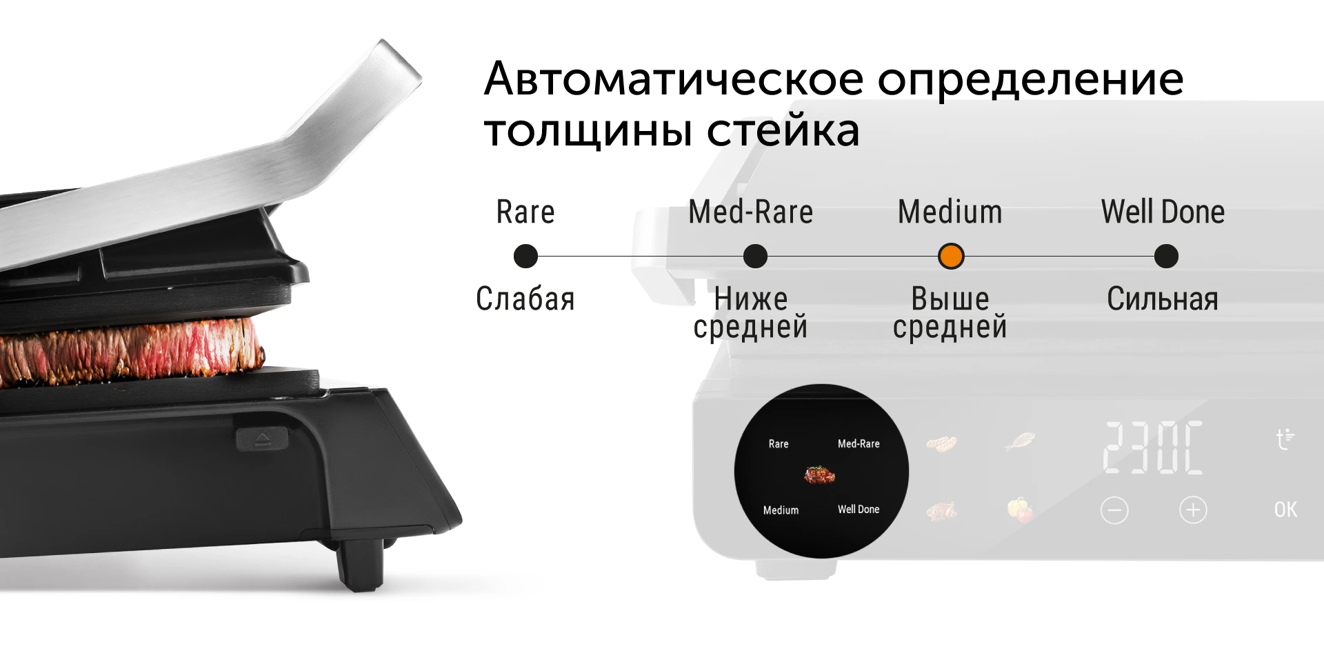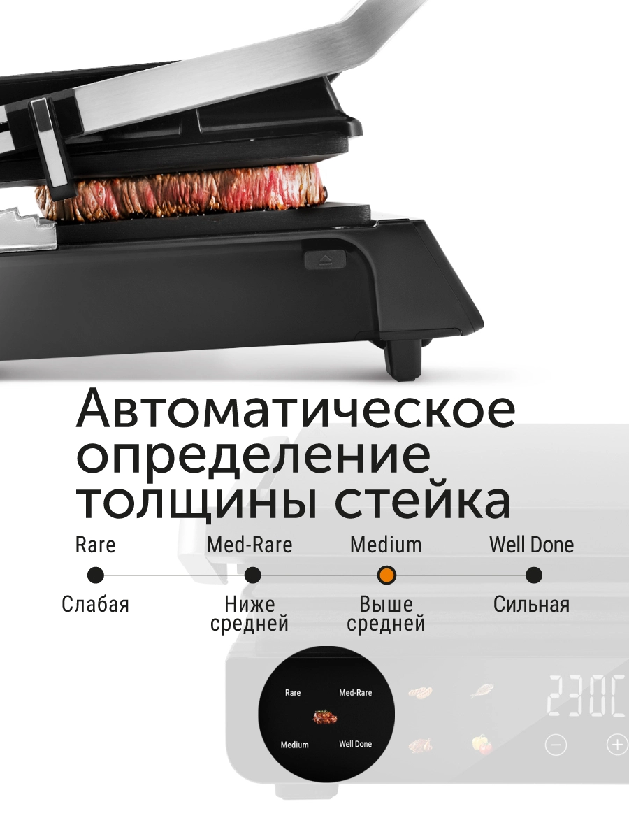 В режиме «Стейк» устройство само определяет толщину и исходя из этого рассчитывает время приготовления. Текущая степень прожарки подсвечивается на панели управления.