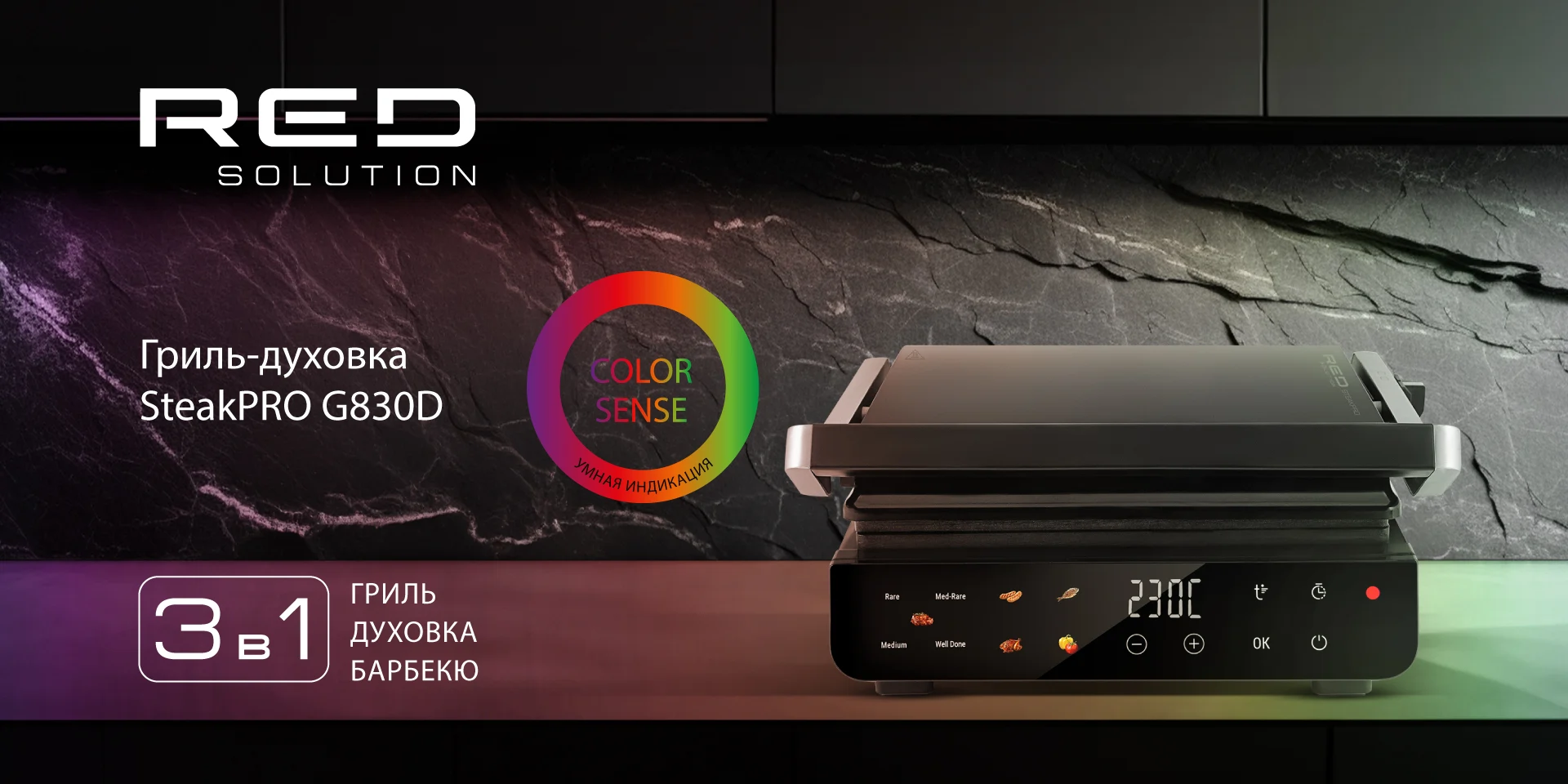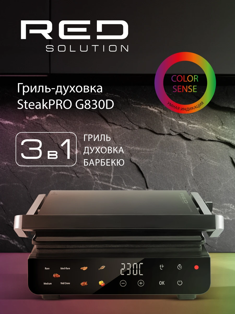 RED SOLUTION COLORSENSE SteakPRO G830D — футуристичный электрогриль мощностью 2000 Вт с сенсорным управлением. Устройство можно использовать как барбекю или мини-духовку. Крышка G830D выполнена из закаленного стекла — благодаря гладким граням гриль смотрится современно и лаконично. Модель имеет 5 авторежимов, автоматическое определение толщины стейка и индикацию степени прожарки. Забудьте о привычной рутинной готовке с RED SOLUTION!
