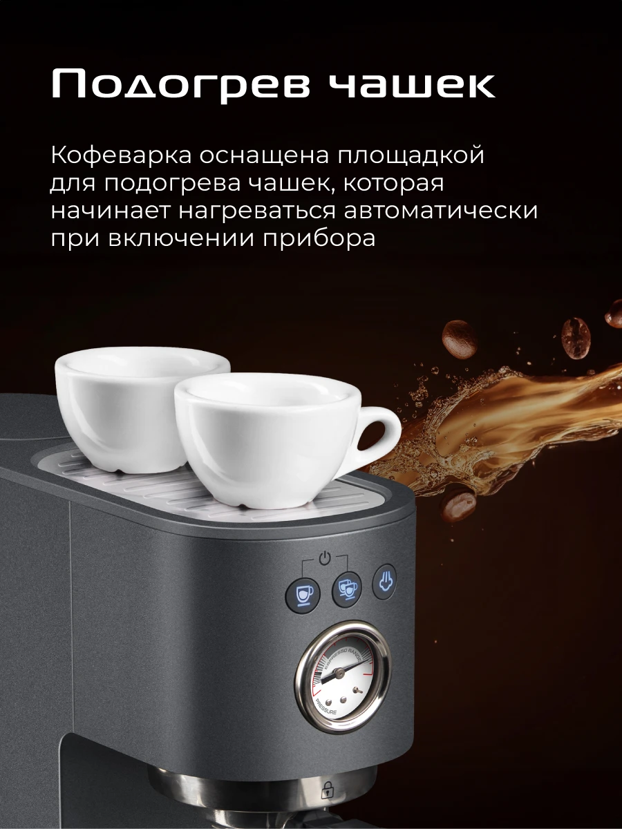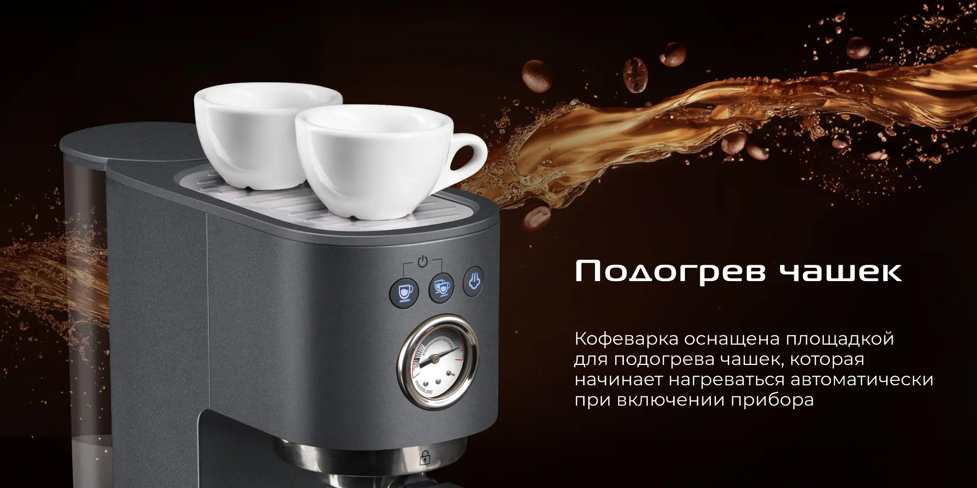 На верхней панели кофеварки расположена площадка для подогрева чашек, так теплая чашка не позволит вашему эспрессо быстро остыть.