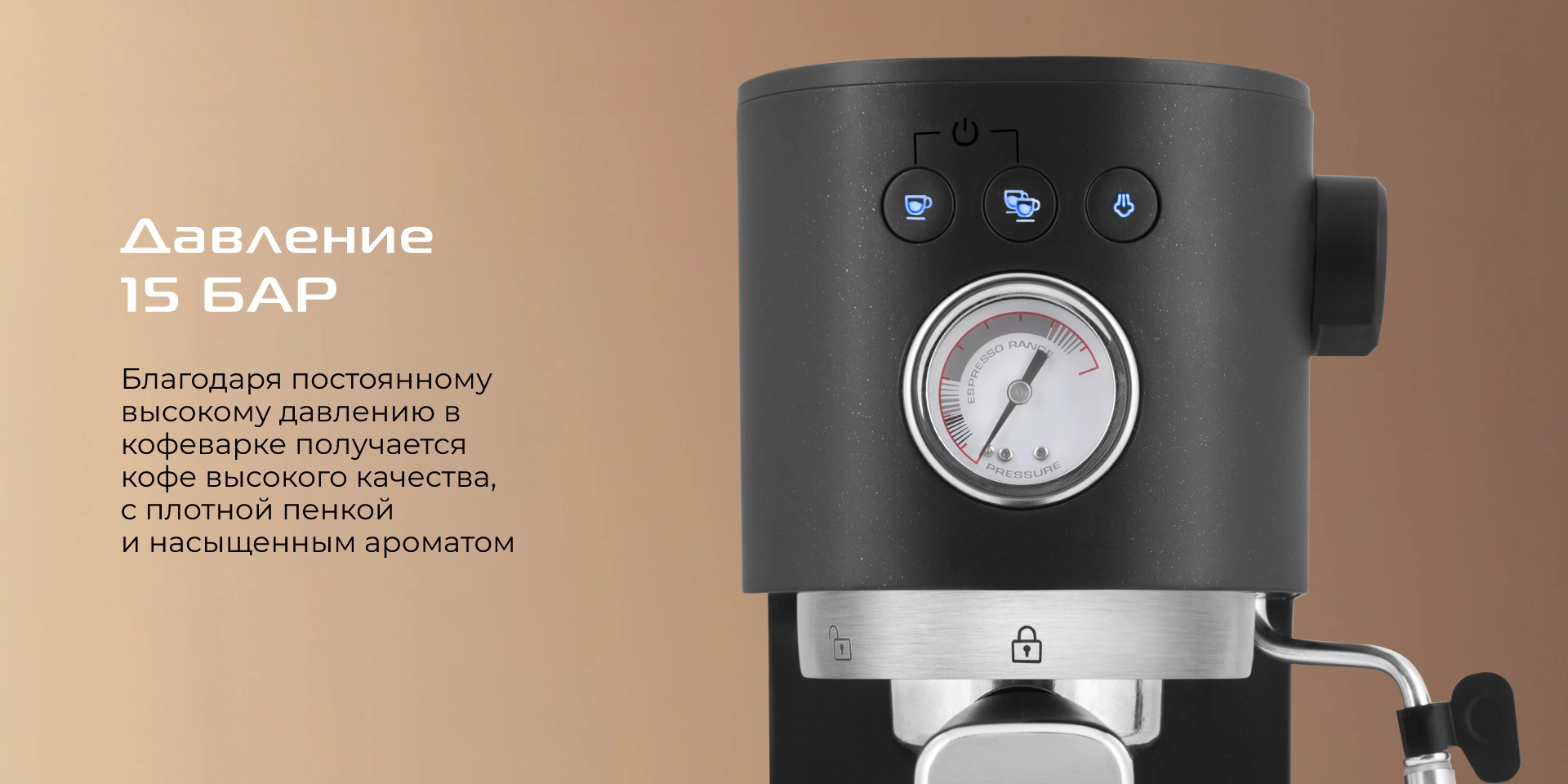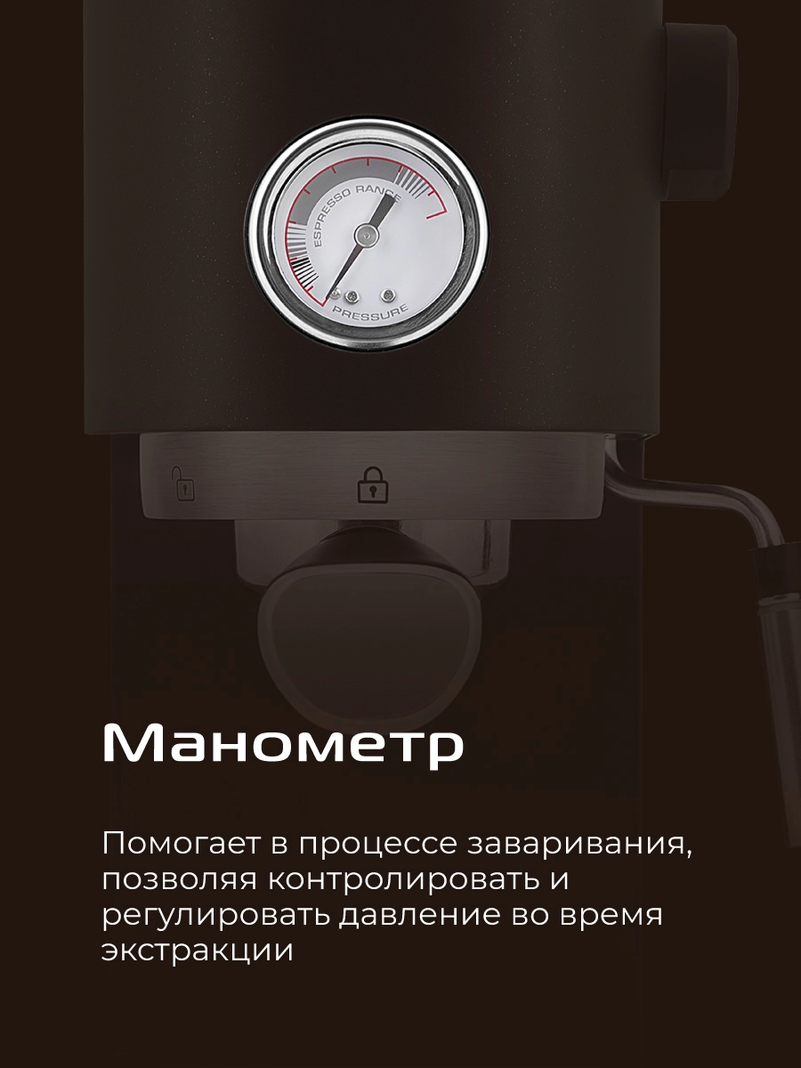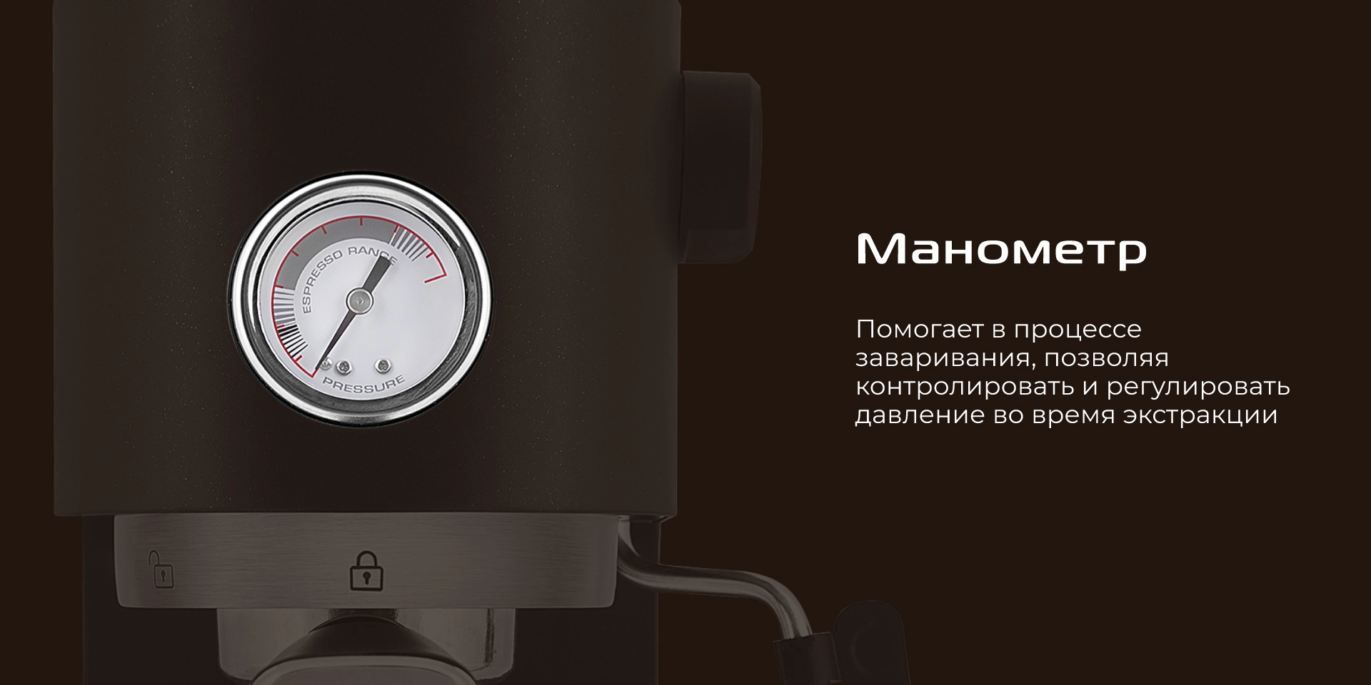 Благодаря высокому давлению кофеварка готовит отличный кофе с плотной пенкой и насыщенным ароматом. Манометр позволит вам наглядно наблюдать за работой помпы, отвечающей за давление.