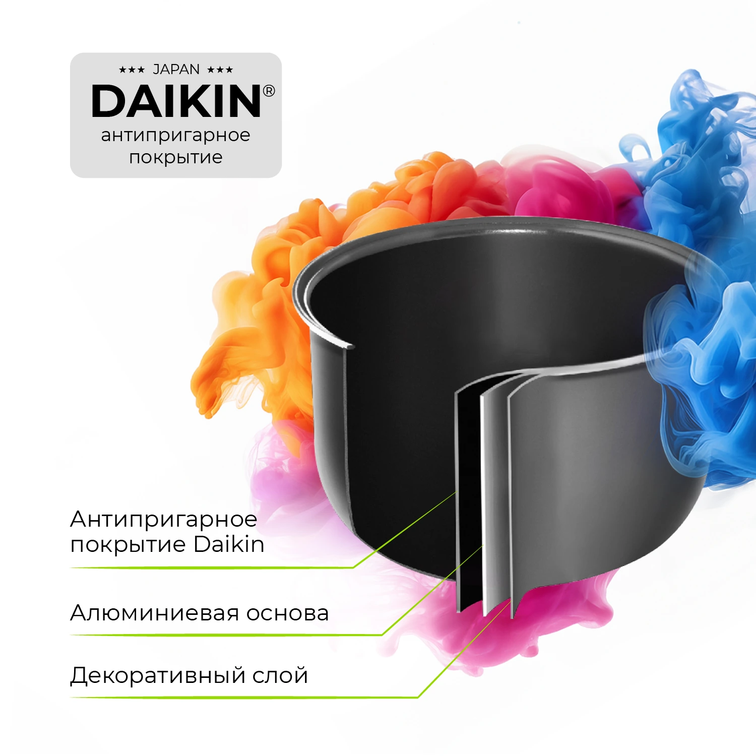 Большой объем чаши позволяет готовить любимые блюда сразу на все семью. Чаша прослужит долго благодаря сертифицированному японскому антипригарному покрытию Daikin ™.
